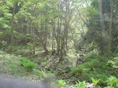 今来た道を後からパシャリ。右にさっきの守り木。ここは両サイドが平坦になっている。なにか建物、もしくは車両の停車場所だったのか?