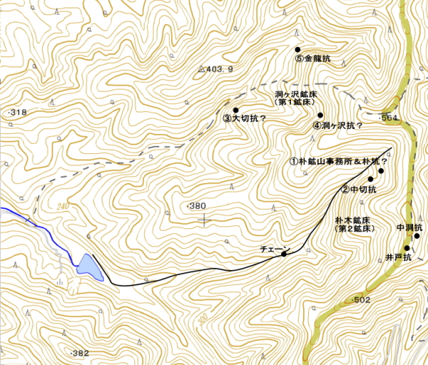 ざっと、位置関係はこのようになる。朴鉱山事務所のすぐそばの坑口は朴抗にはるのか?また、近くには中切抗があるようだ。洞ヶ沢にも幾つもの抗口があるようだ。やはり、これで終わらせるにはもったいない、行くしかない!
