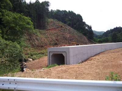 林道と言っても、まだ、この辺りは舗装路だ。ちょっと走ると、山の斜面を重機で伐採中。多分、この斜面にはトンネルが出来るハズ。その為の伐採だろう。トンネルは簗川トンネルとなり、つぎの新区界トンネルに繋がっていく予定。